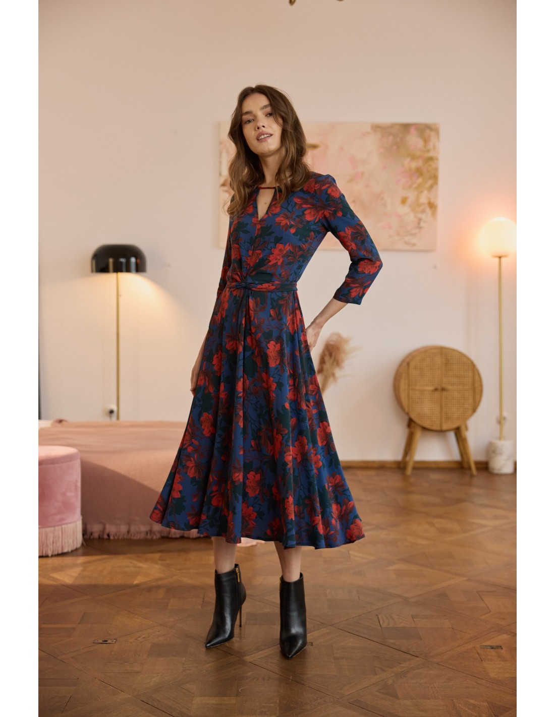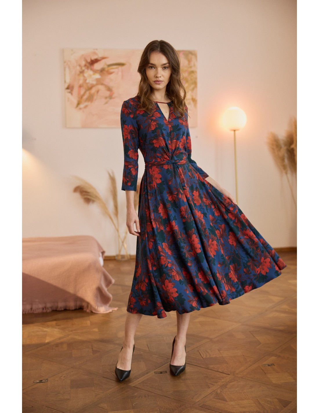 Kluczowy detal – piękne szarfy w talii – nadaje całości niepowtarzalnego charakteru. Dodatkowo służą one jako regulacja w talii, możesz je dowolnie wiązać. Ta sukienka to jedyna w swoim rodzaju propozycja, która z pewnością wyróżni Cię w tłumie.