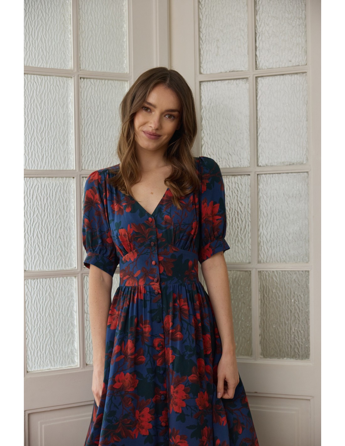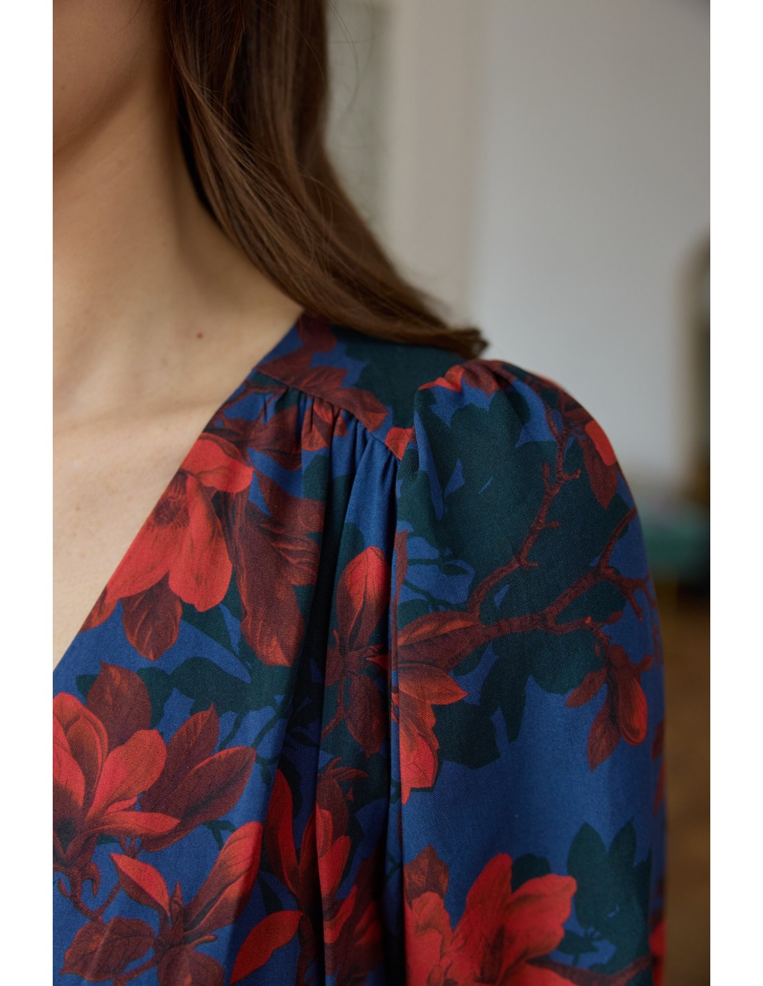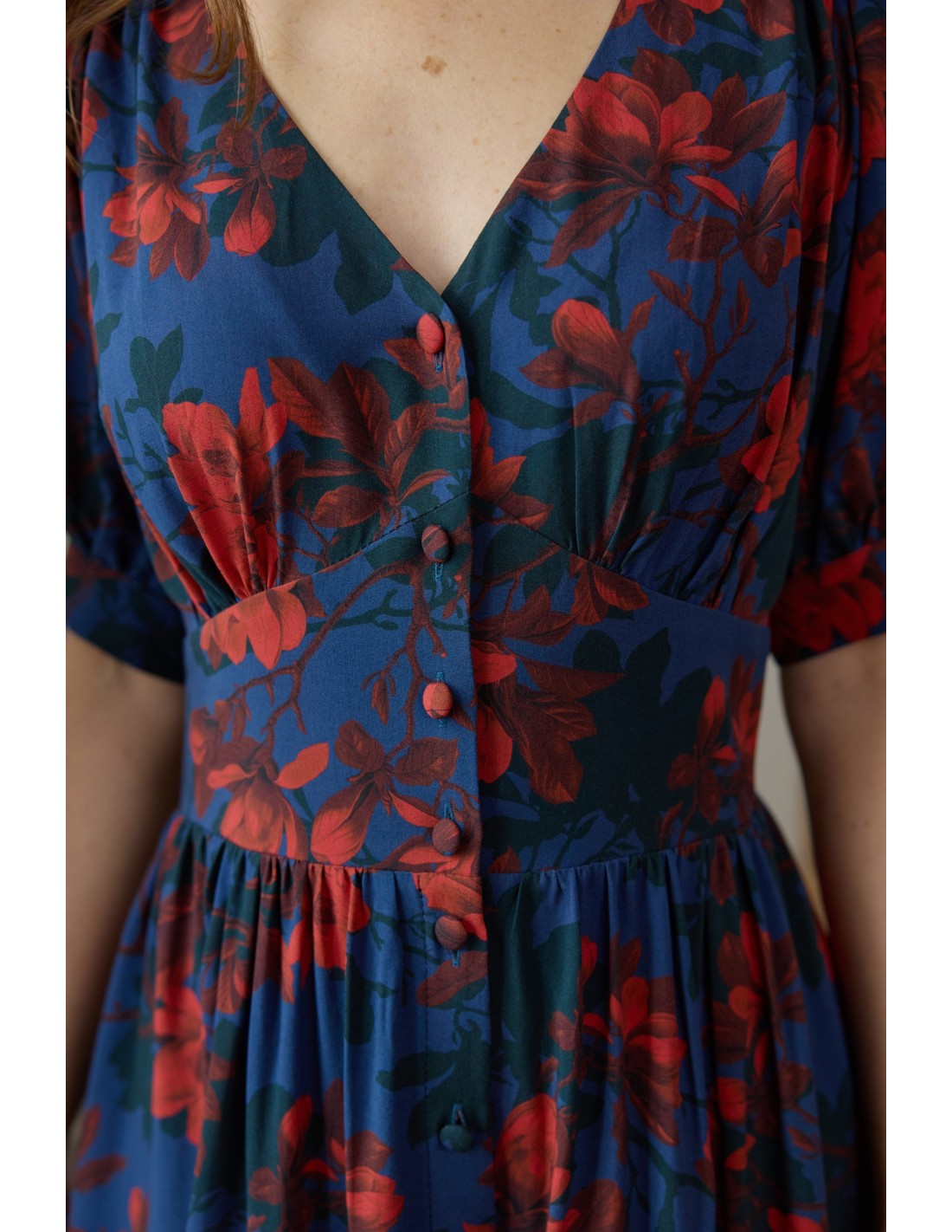 Wyobraź sobie miękką wiskozę ECOVERO, która otula Twoje ciało – zupełnie jak delikatne płatki kwiatów. Będziesz oczarowana, jak optycznie wydłuża ona szyję, zaznacza talię i podkreśla biust oraz biodra. Oblekane guziki, którymi możesz regulować głębokość rozporka, na pewno przykują niejedno spojrzenie. Kobiecy fason, wysoka jakość certyfikowanej tkaniny oraz piękne wykonanie sprawią, że pokochasz ją od pierwszego założenia!