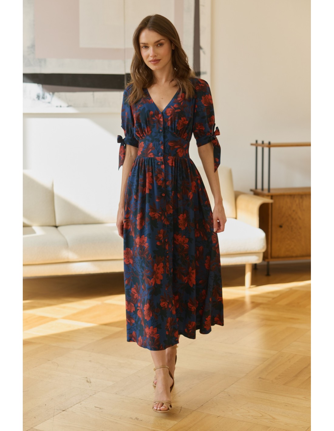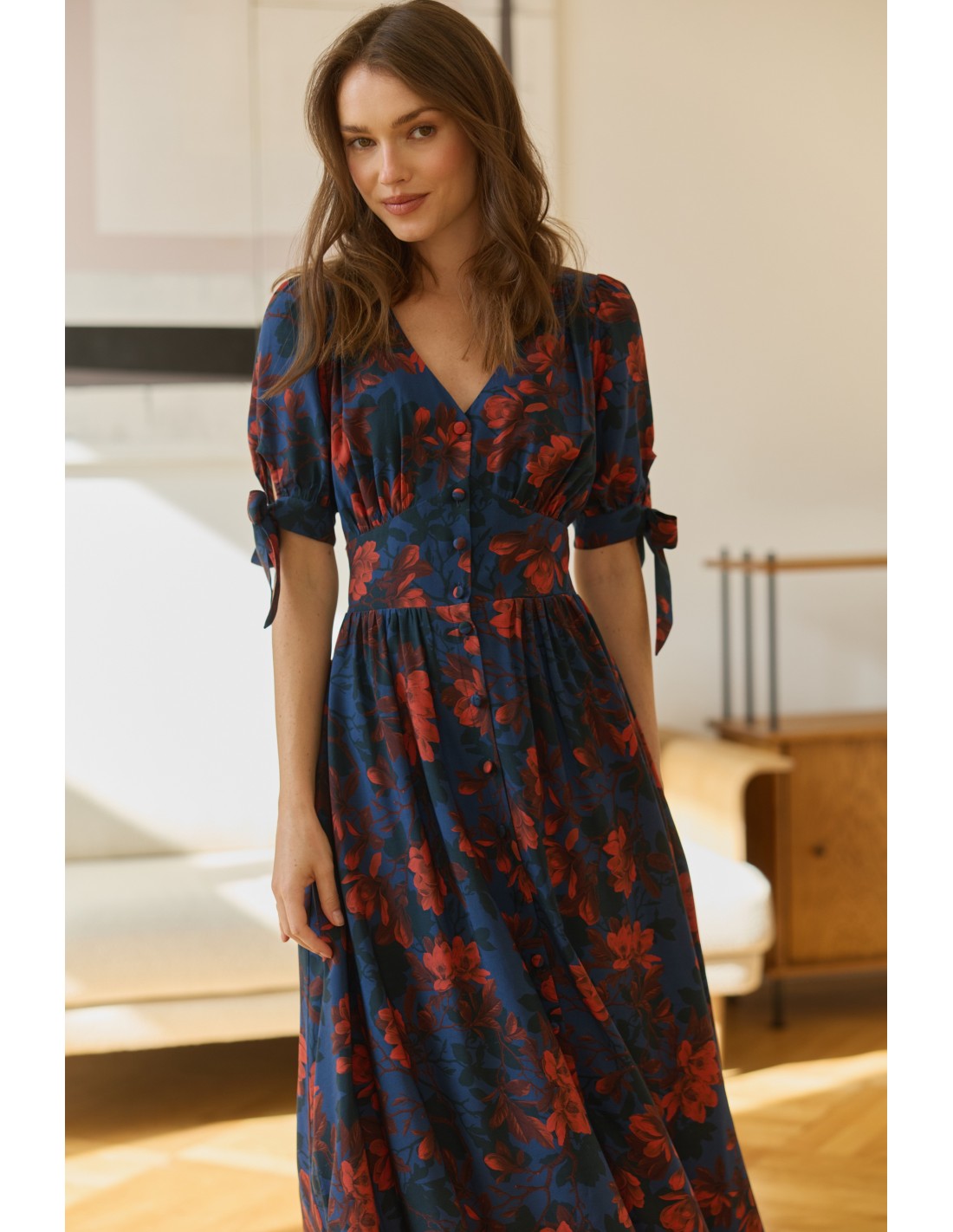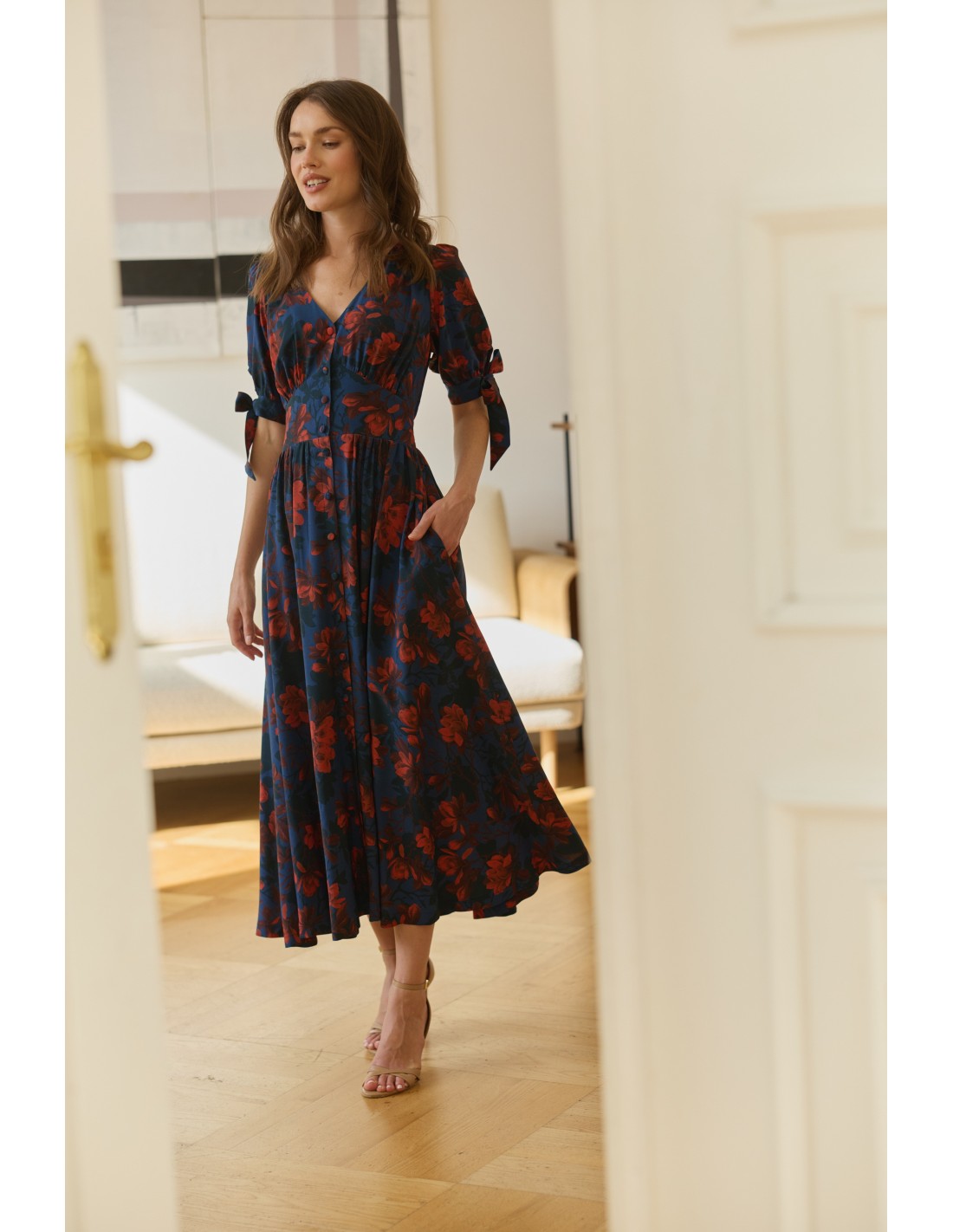 Zachwyci Cię, jak pięknie wydłuża szyję, eksponuje biust i delikatnie podkreśla biodra. Oblekane guziki biegnące wzdłuż sukienki pozwalają regulować głębokość rozporka. Kokardki na rękawach wprowadzają dziewczęcy akcent, a elegancka długość sprawia, że to kreacja idealna na wiele okazji - od codziennych spacerów po wyjątkowe uroczystości.