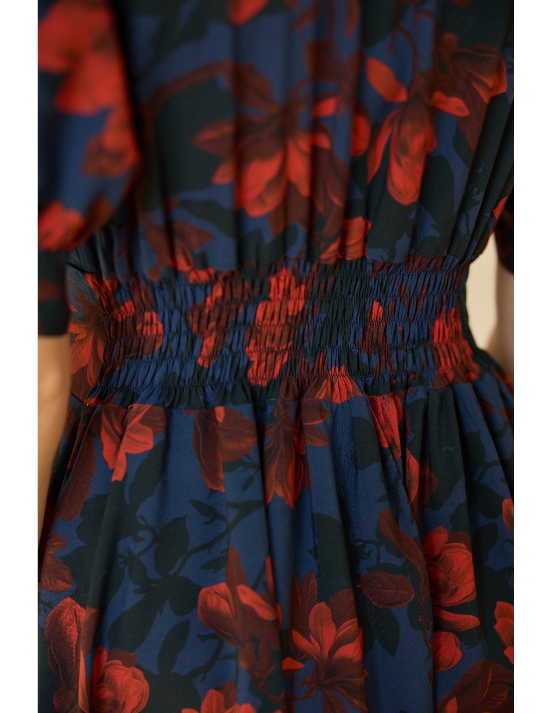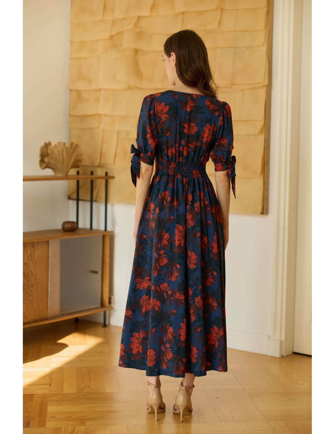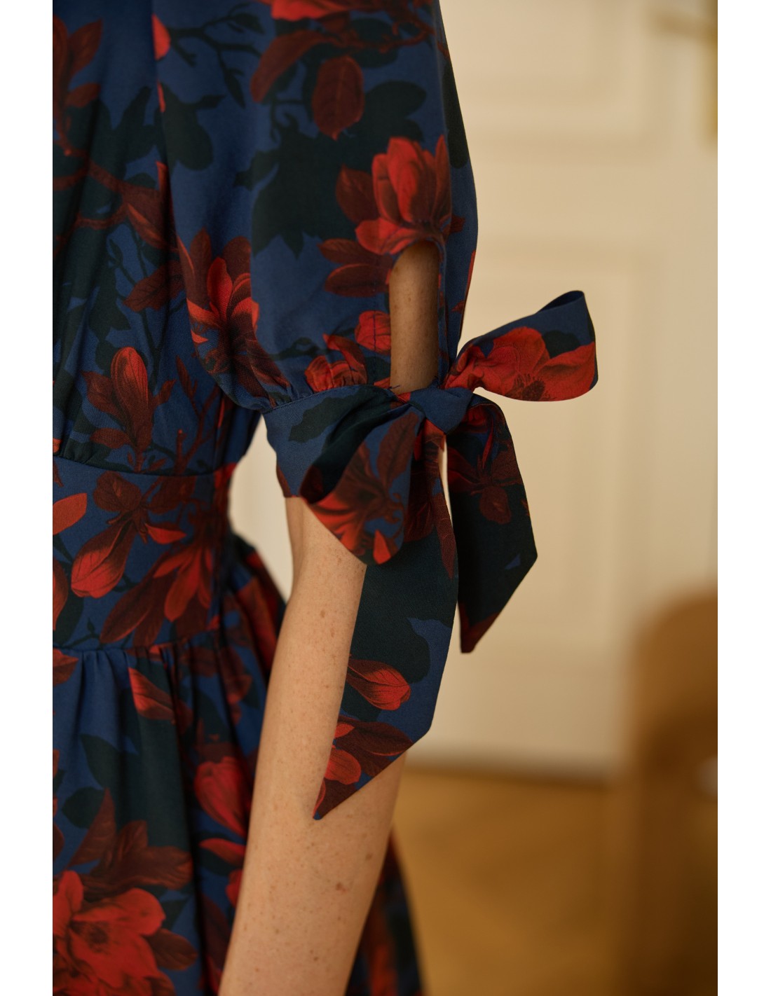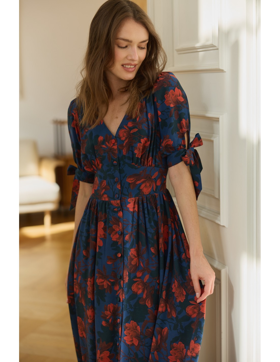 Zachwyci Cię, jak pięknie wydłuża szyję, eksponuje biust i delikatnie podkreśla biodra. Oblekane guziki biegnące wzdłuż sukienki pozwalają regulować głębokość rozporka. Kokardki na rękawach wprowadzają dziewczęcy akcent, a elegancka długość sprawia, że to kreacja idealna na wiele okazji - od codziennych spacerów po wyjątkowe uroczystości.