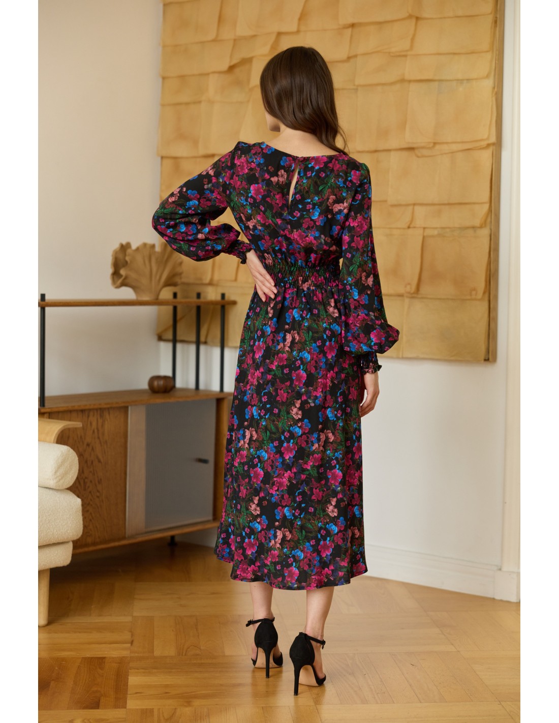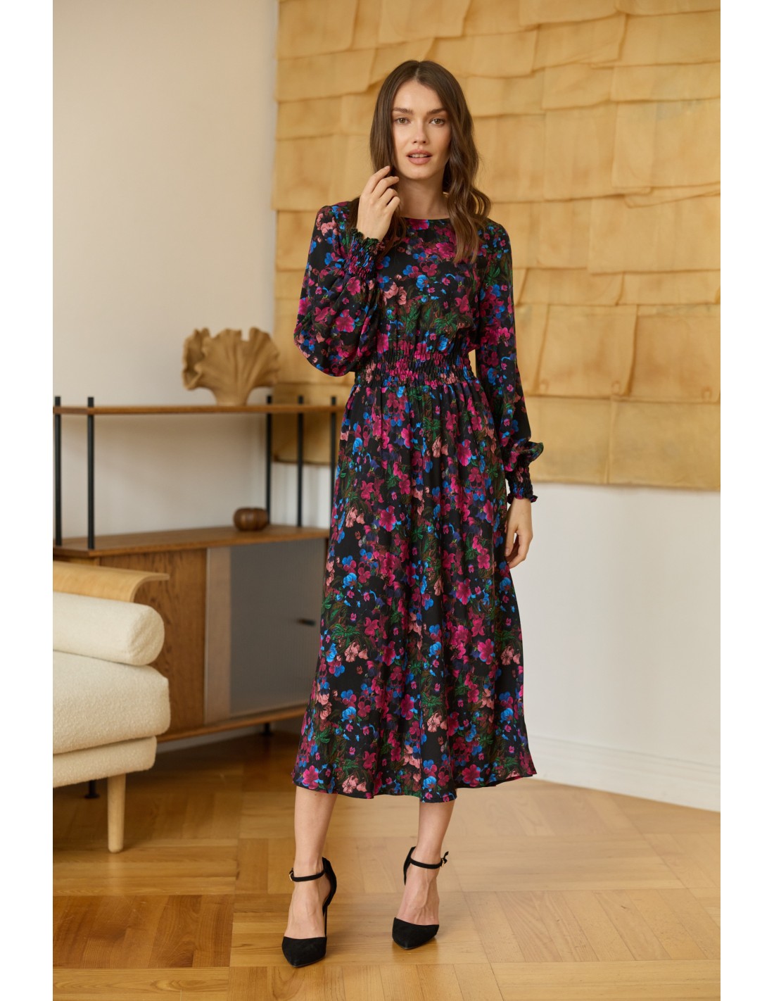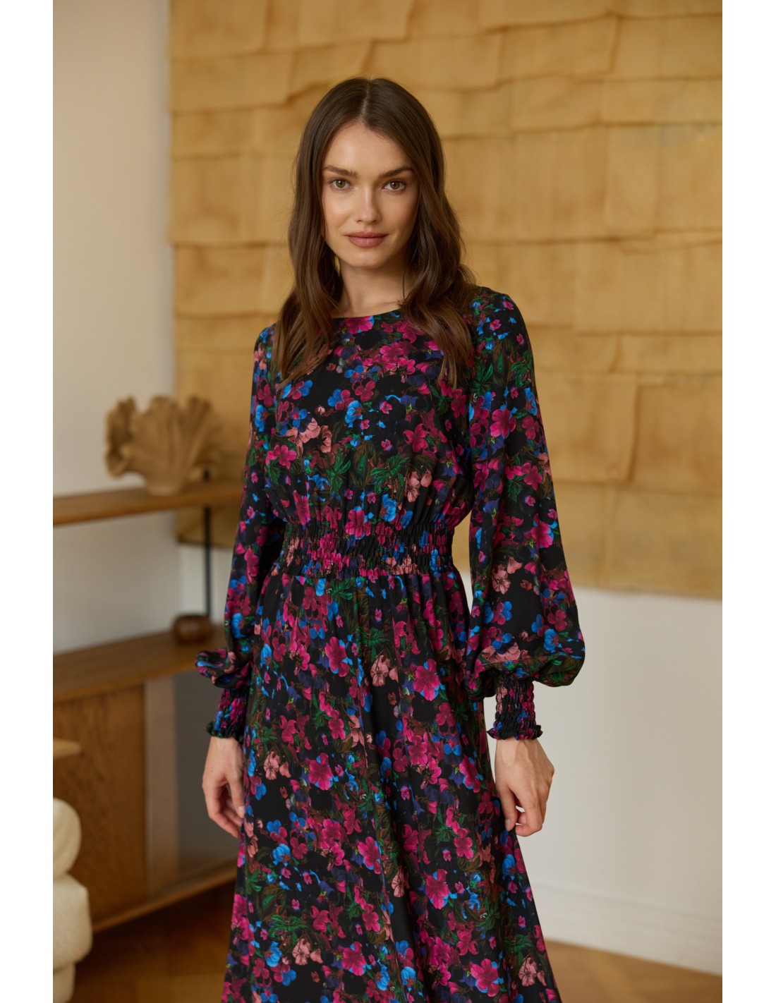 Ta sukienka to esencja ponadczasowej elegancji i subtelnego minimalizmu. Jej długa, lekka forma swobodnie opływa sylwetkę, a delikatne gumonici w talii i przy zakończeniach rękawów nadają jej harmonijny kształt i podkreślają naturalne linie ciała.