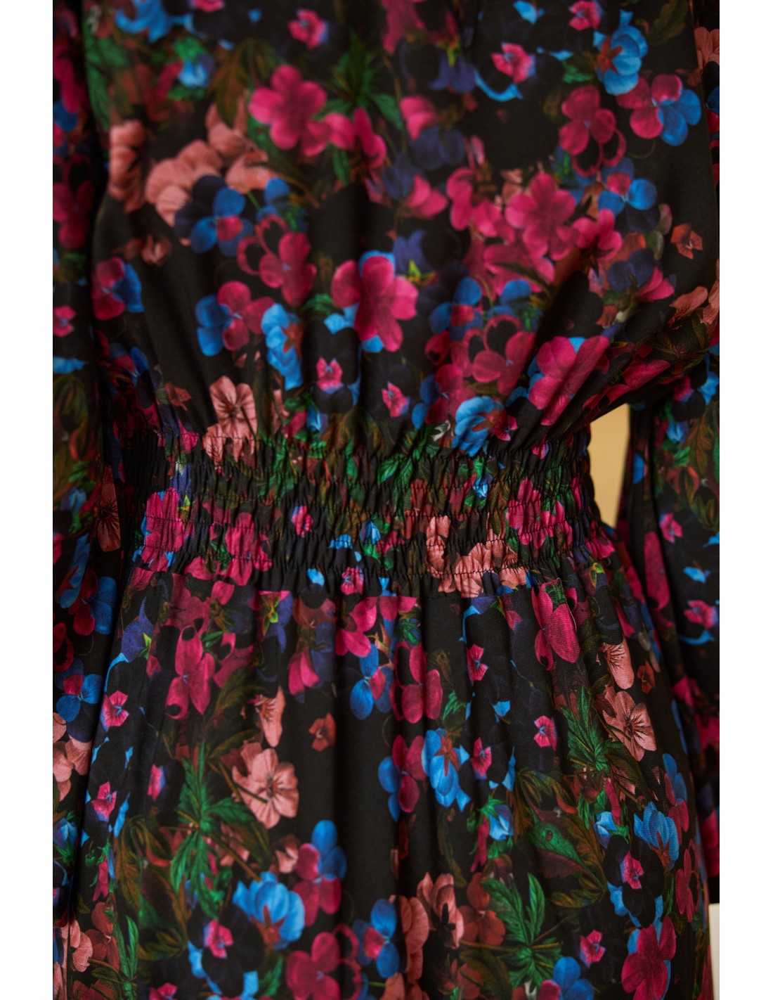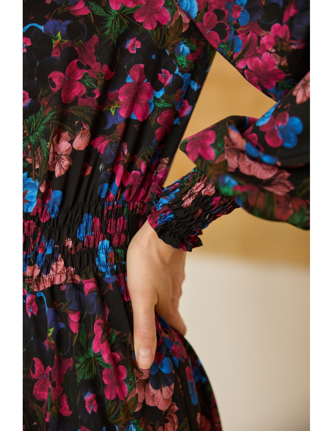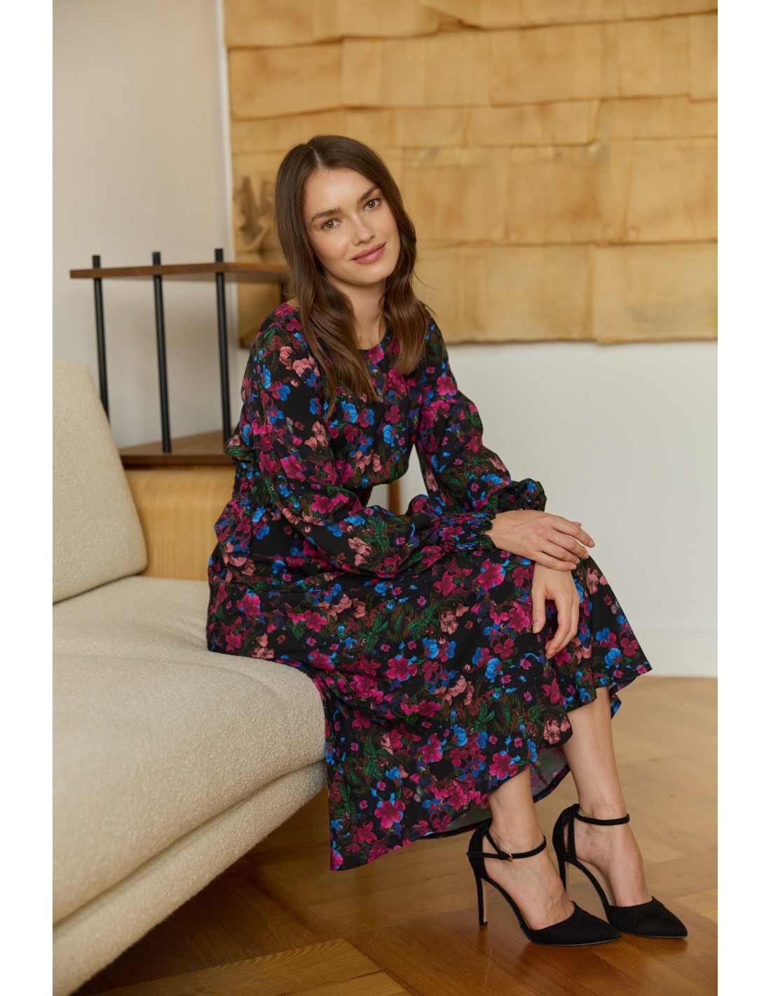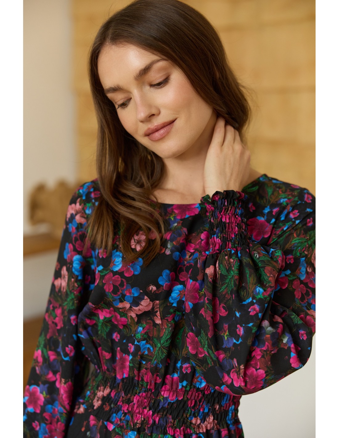 Ta sukienka to esencja ponadczasowej elegancji i subtelnego minimalizmu. Jej długa, lekka forma swobodnie opływa sylwetkę, a delikatne gumonici w talii i przy zakończeniach rękawów nadają jej harmonijny kształt i podkreślają naturalne linie ciała.