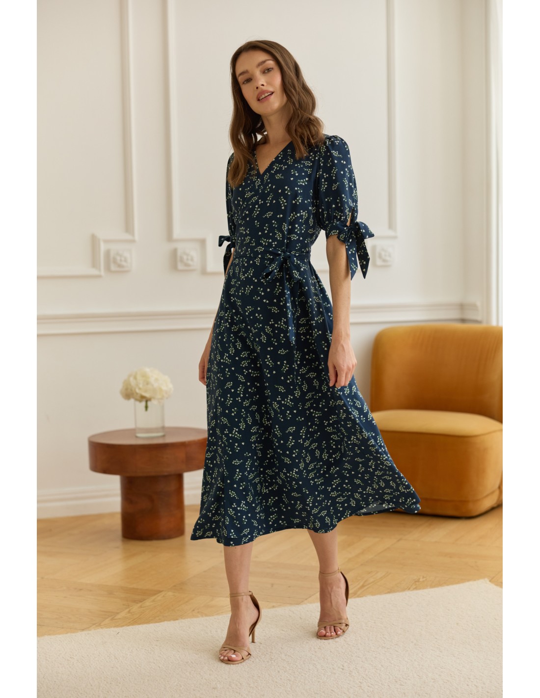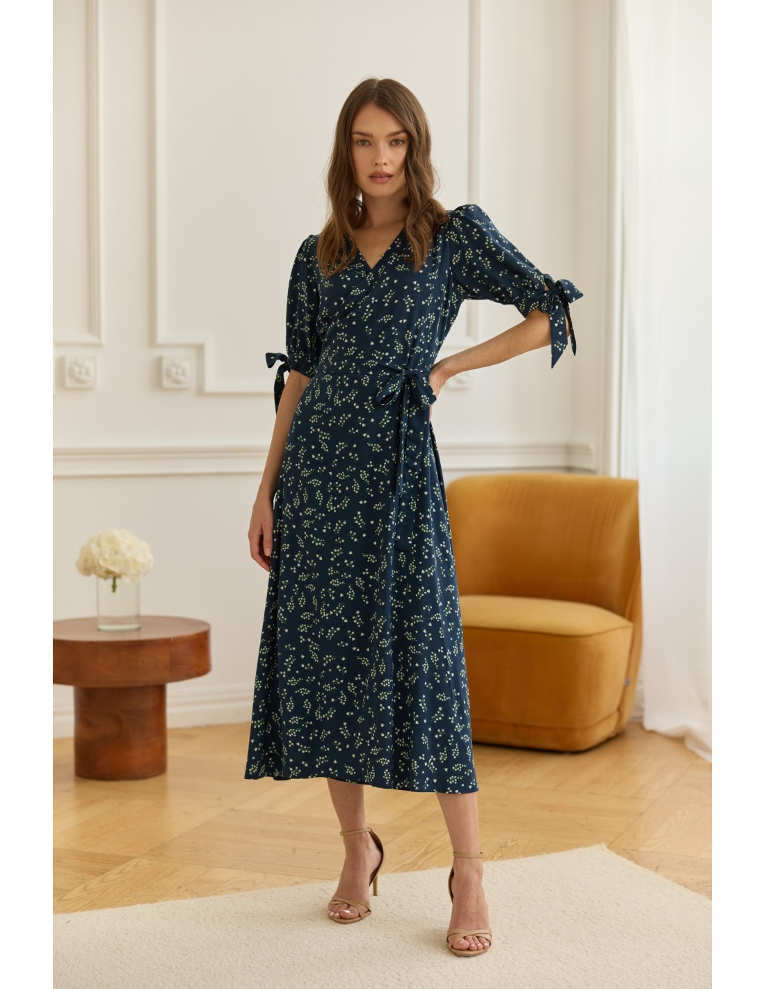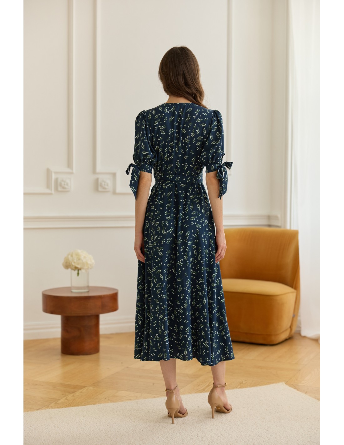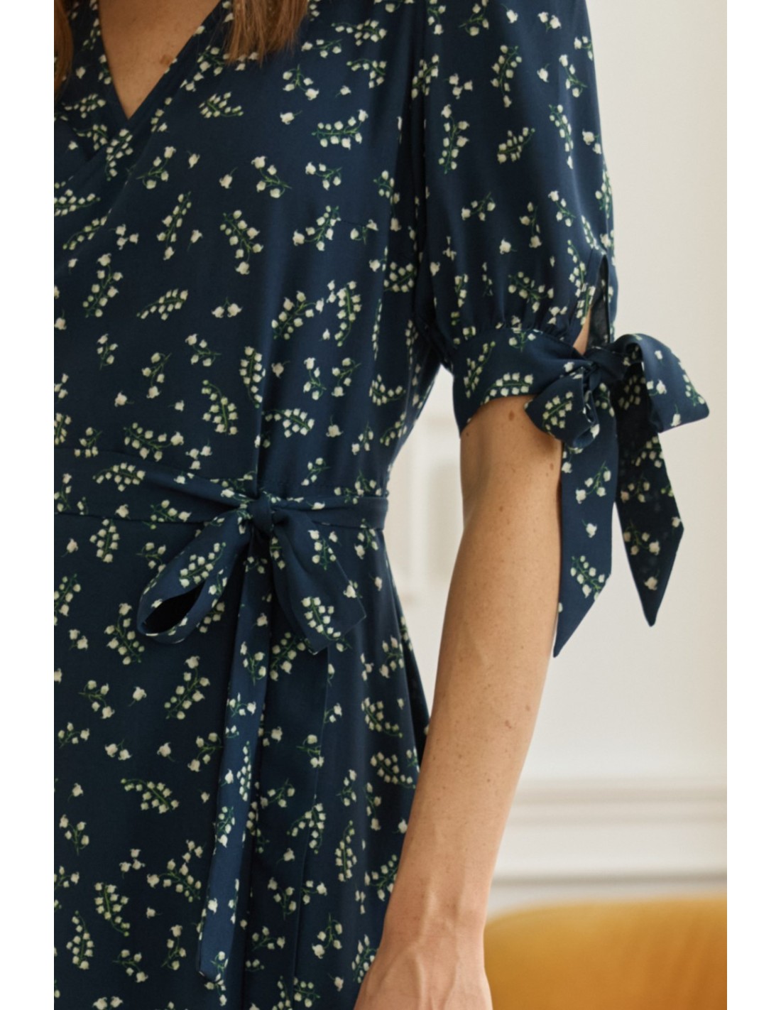 Delikatne wiązanie z boku pozwala idealnie dopasować ją do sylwetki i podkreślić talię. Dekolt w kształcie litery V wysmukla szyję i subtelnie eksponuje obojczyki, a urocze kokardki na rękawach dodają całości romantycznego charakteru.