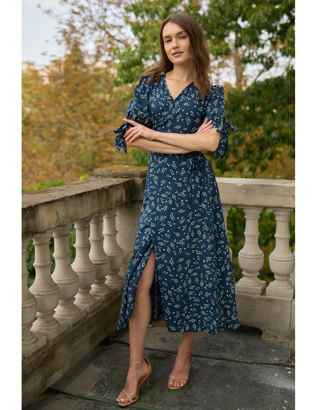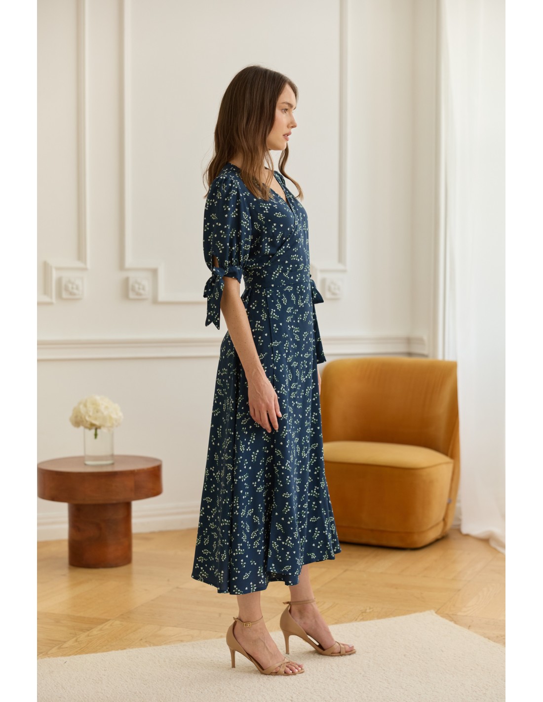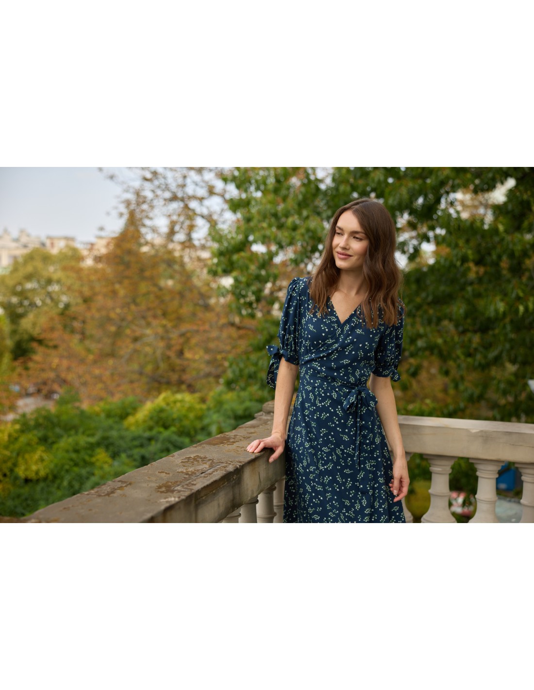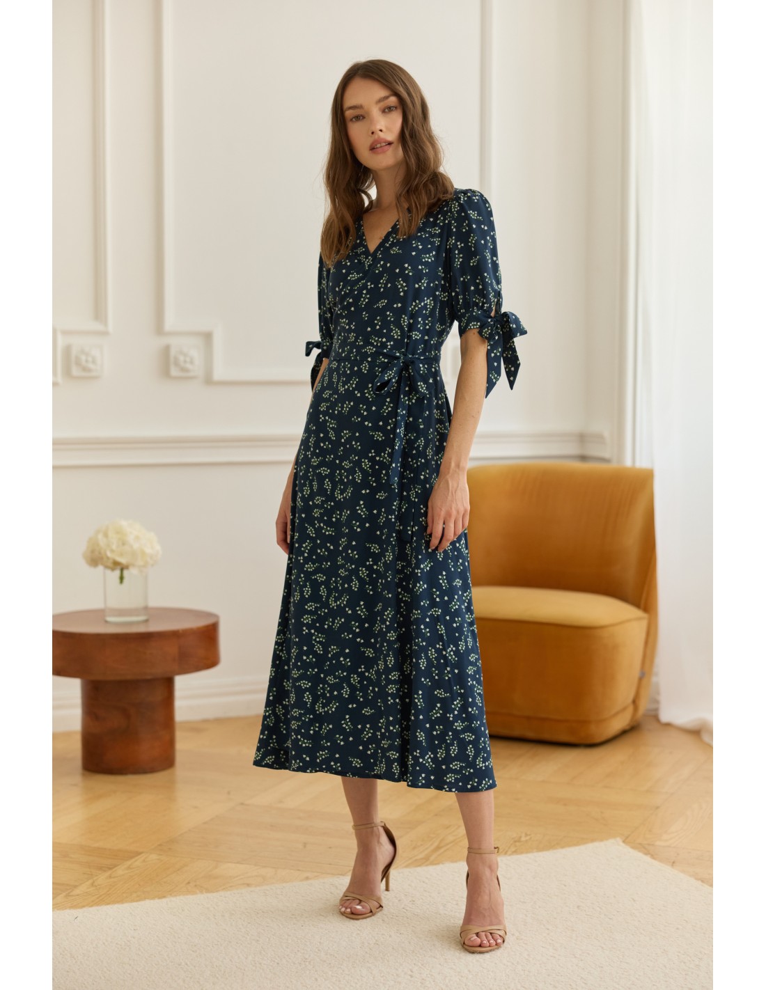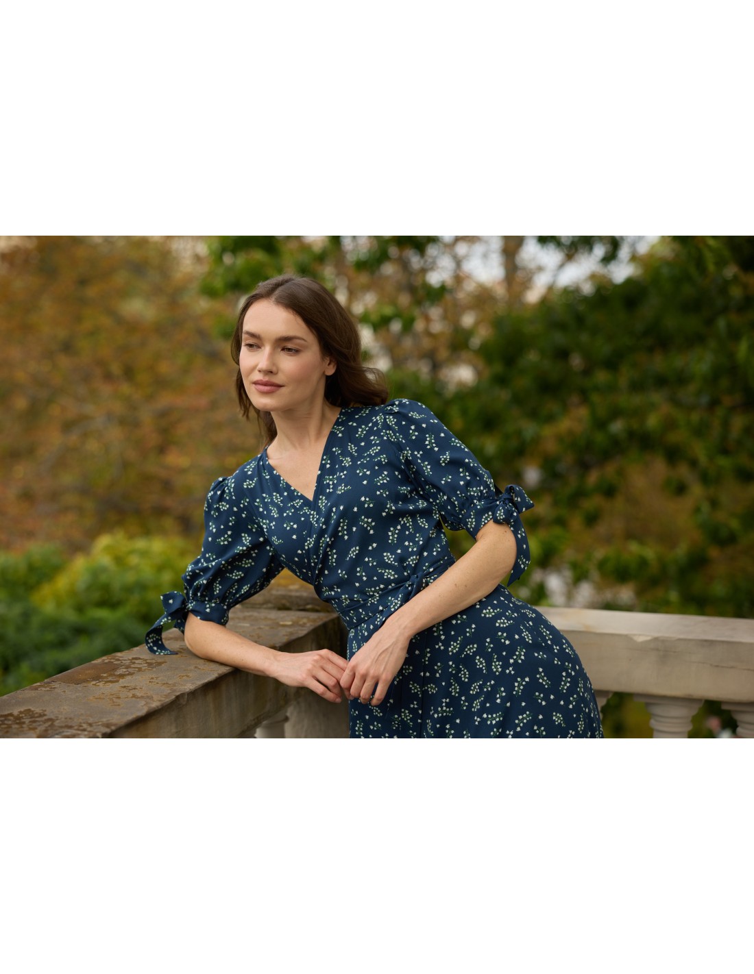 Delikatne wiązanie z boku pozwala idealnie dopasować ją do sylwetki i podkreślić talię. Dekolt w kształcie litery V wysmukla szyję i subtelnie eksponuje obojczyki, a urocze kokardki na rękawach dodają całości romantycznego charakteru.